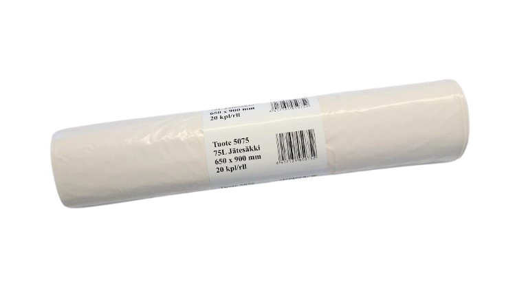 JÄTESÄKKI 75 L Keskikokoisen roskiksen valkoinen suojasäkki! Materiaali: LD-PE. Koko: 650 x 900 mm. Vahvuus: 0,040. Väri: valkoinen 20 pss/rll, 15 rll/ltk, 48 ltk/lava.