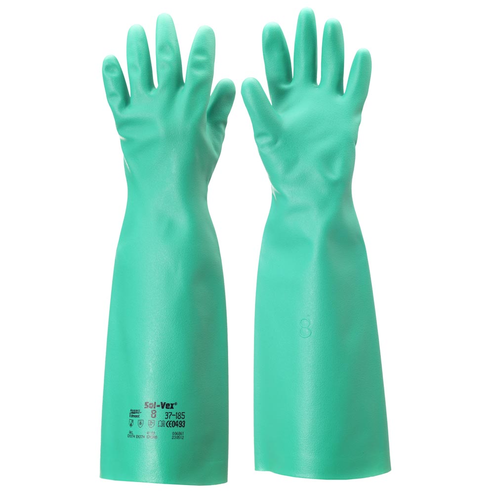 Pitkävartinen paksu nitriilikäsine. Vahva kemikaalinkestokäsine kyynärpäähän ulottuvalla ja suojaavalla rannekkeella. Piston- ja hankauksenestosuoja. Nukkavuori. Kohotettu kämmenkuvio.