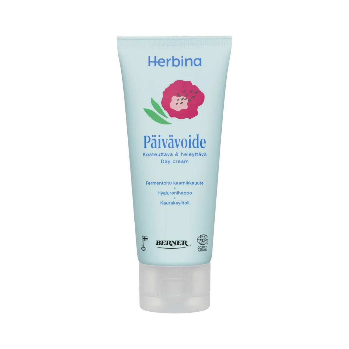 Nopeasti imeytyvä Herbina Kosteuttava päivävoide 50ml heleyttää ja kosteuttaa ihoa. Kevyt koostumus jättää iholle miellyttävän tunteen ja sopii myös meikin alle. Sisältää ihon hyvinvointia ylläpitäviä aineosia, kuten fermentoitua kaarnikkauutetta, kauraksylitolia ja hyaluronihappoa.