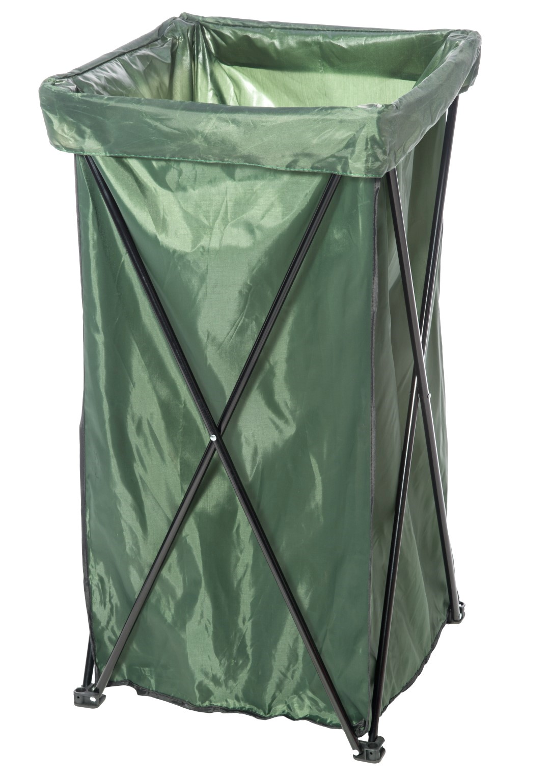 Kokoontaitettava roskasäkkiteline on kätevä puutarhahommissa, mökillä, juhlissa, kahvioissa tai missä vain missä on tarvetta väliaikaiselle roskikselle. Kestävän polyesteristä valmistetun jätepussin saa irrotettua tyhjennystä varten ja sen voi uudelleenkäyttää. Polyesterisäkin sisään voi laittaa myös kertakäyttöisen muovisen jätesäkin, joka pystyy telineessä siististi ja hyvin paikoillaan. Taittuu pieneen kokoon säilytystä varten.