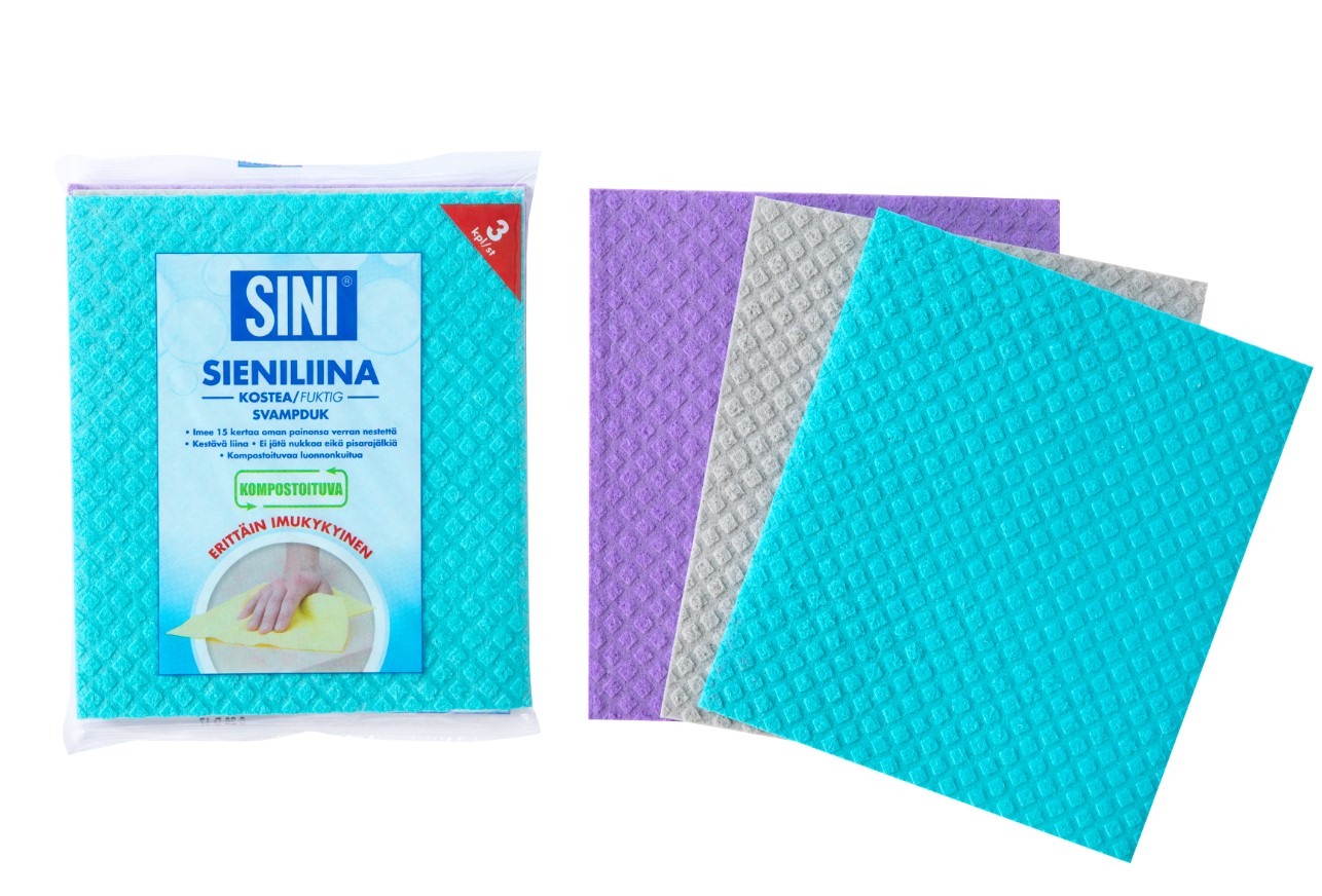 Valmiiksi kostutettu sieniliina on imukykyinen ja kestävä tiskirätti, joka sopii keittiön tai kylpyhuoneen perusliinaksi. Sieniliinat imevät jopa 15 kertaa oman painonsa vettä. Liina ei nukkaa, eikä jätä pisarajälkiä. Sini kostea sieniliina on 100% biohajoava, muoviton ja kompostoituva.