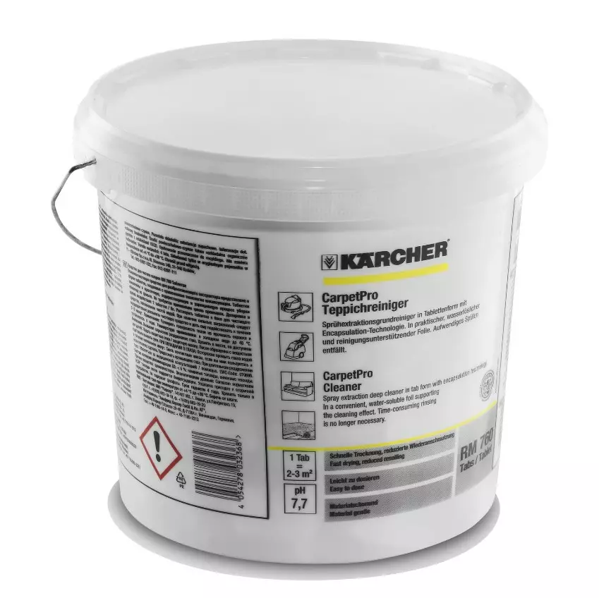 CarpetPro Cleaner RM 760 Tablet on tekstiilipesurille ja ammattilaisten painehuuhtelulaitteelle tarkoitettu syväpudistava pesuaine tablettimuodossa.