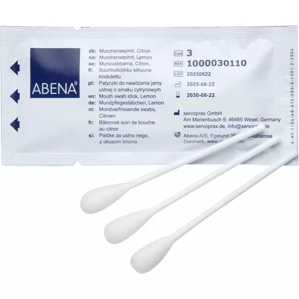 Kostutettu steriili Abena suunhoitotikku, jota käytetään limakalvojen ja kielen kostuttamiseen. Sitruuna aktivoi sylkirauhasia ja glyseriini voitelee limakalvoja.