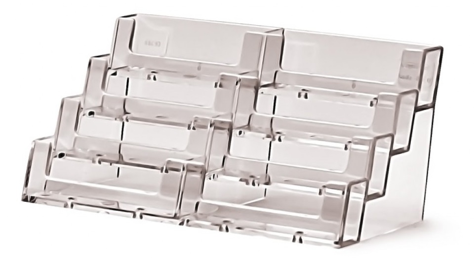 Käyntikorttiteline 8-os. Valmistettu läpinäkyvästä PS-muovista. Sisämitat: Leveys: 93 mm. Korkeus: 50 mm. Taskun syvyys: 18 mm. Ulkomitat: Leveys: 197 mm. Korkeus: 93 mm. Pituus: 112 mm. Muovin... Lue lisää