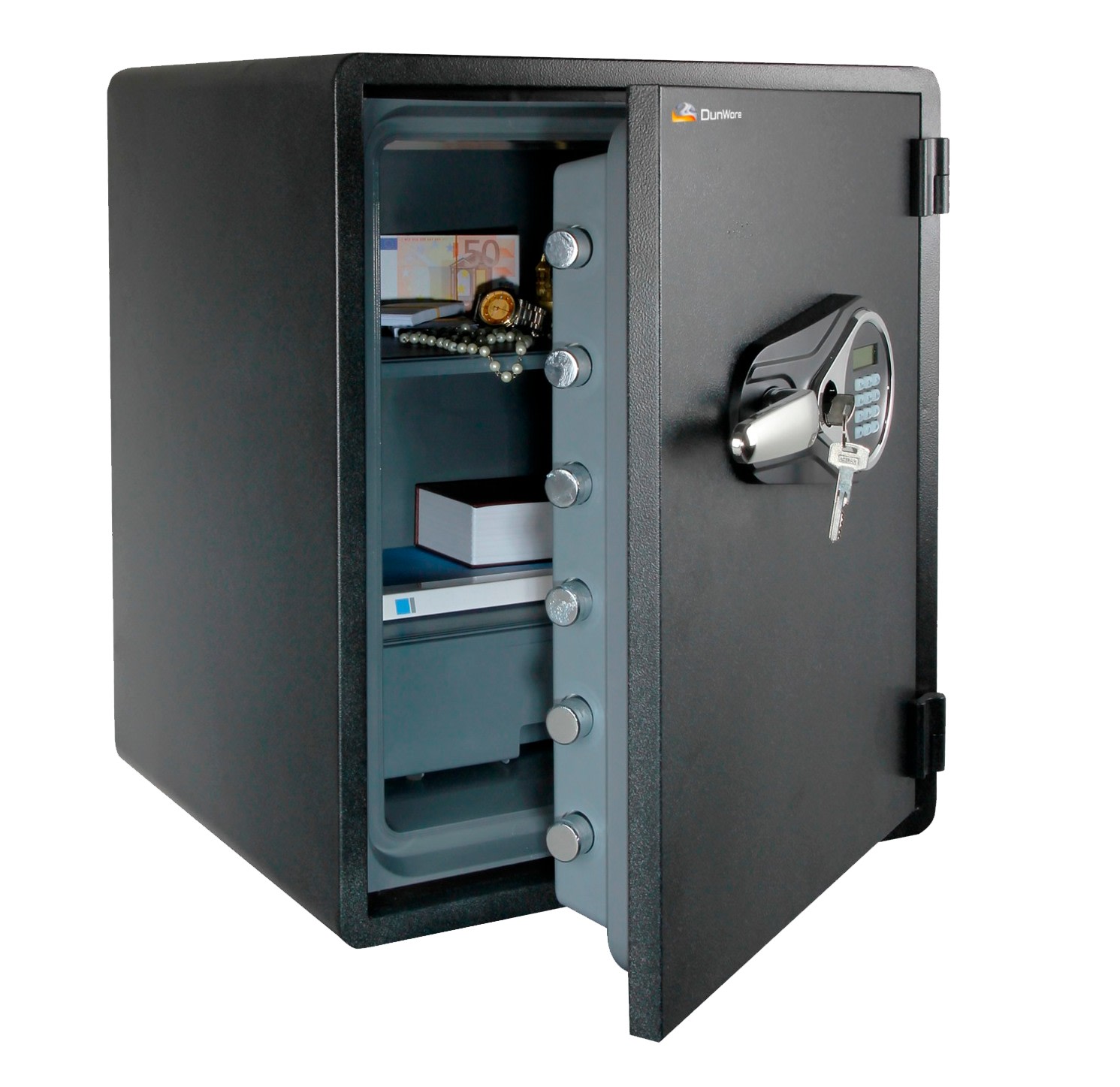 Järeän kokoisessa DunWore LCD590 paloturvakaapissa säilytät kaikki tärkeimmät arvoesineet ja tärkeät dokumentit niin kotona kuin toimistoissakin. Paloturvakaappi kestää niin tulipaloa kuin sammutusvettäkin. Turvakaapin oven saa auki joko avaimella tai sarjanumerolla. Tarvitset kaappiin joko digitaalisen avainyhdistelmän tai fyysisen avaimen. Voit hätätilanteessa itse ohittaa digitaalilukituksen ja avata kaapin hätäavaimella. Murtovarmuutta antavat kolme salpaa, kaksi lukkiutuvaa murtosalpaa ja suojaus magneettiaukaisua vastaan. Kaapin ovessa on 5 kpl pieniä koukkuja avainten ym. esineiden ripustusta varten.