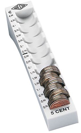 WEDO Rahansarakealusta 5 snt kolikoille. Selkeästi merkatut kolumnit kolikoille. Laskee 25 snt nipuin. Väri: vaaleanharmaa. Mitat: 18 x 3,4 x 4,4 cm.
