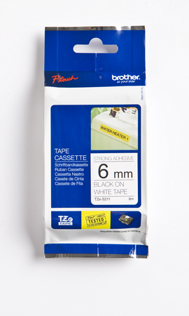 BROTHER Laminoitu lujasti kiinnittyvä tarranauha lev. 6 mm . Musta teksti / valkoinen pohja.
