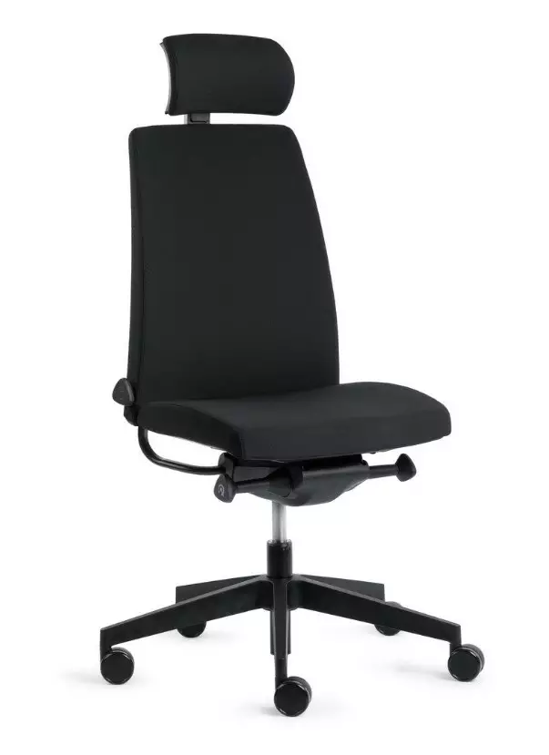 Työtuoli niskatuella ja monipuolisilla säätöominaisuuksilla sekä edistyneellä ristiseläntuen säädöllä.