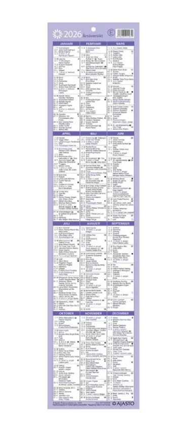 Koko 102 x 430 mm; kielisyys: suomi, ruotsi; kirkkopyhät; runsaasti nimipäiviä; ripustusreikä; Avainlippu-tuote; FSC®-sertifioitu tuote.